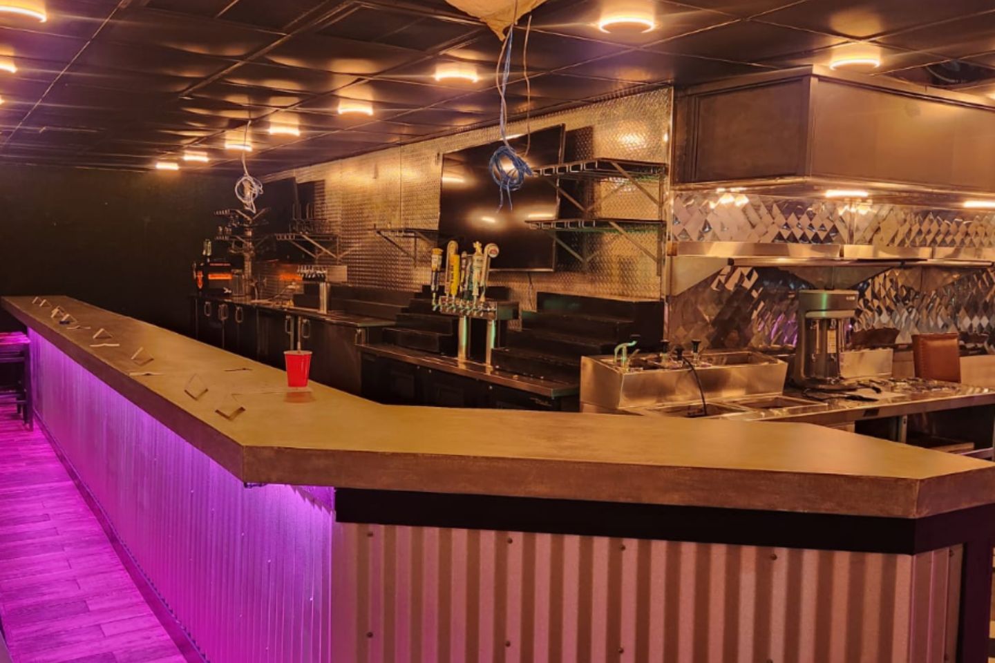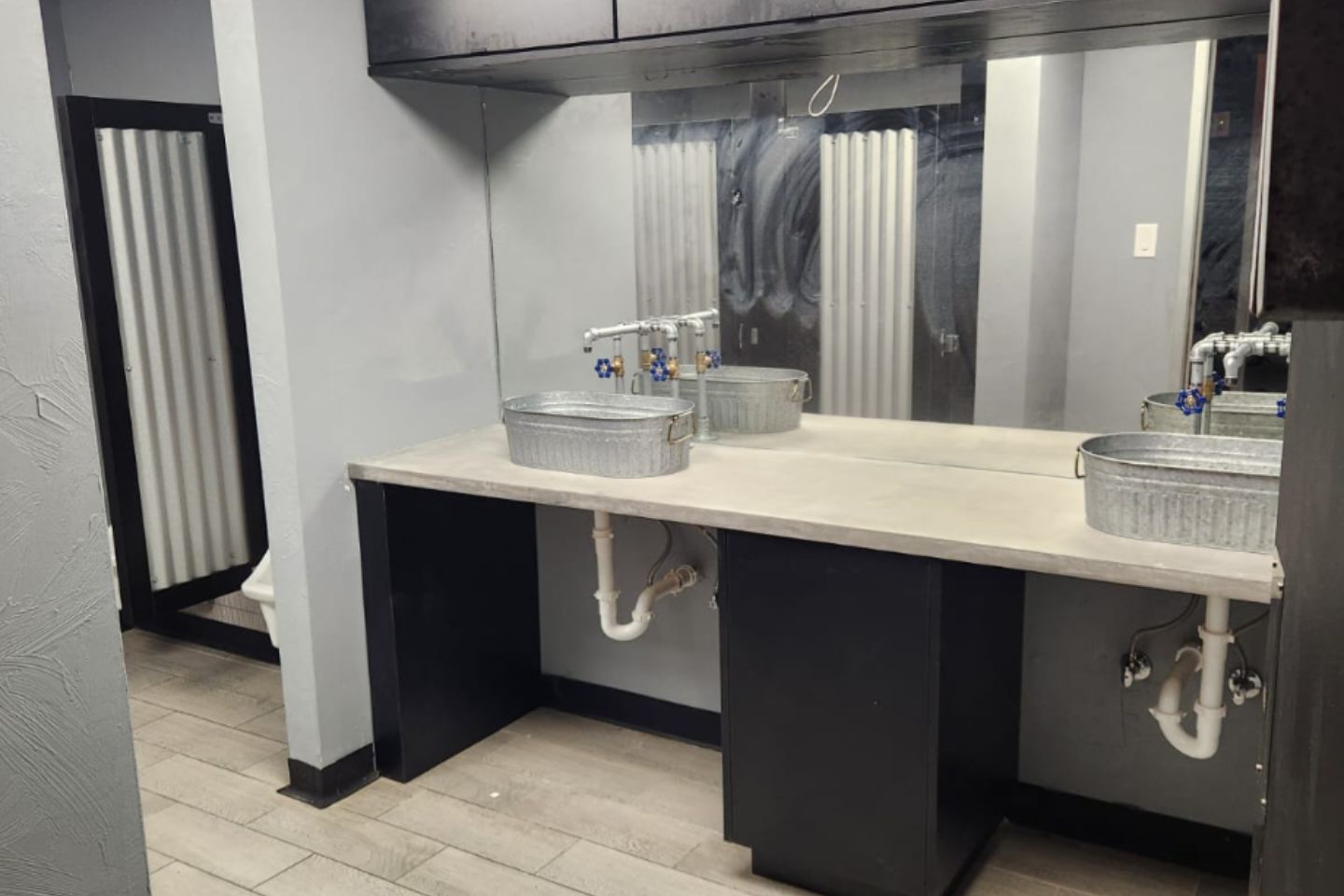 The original wooden bar top and laminate tables were showing their age. In the bathrooms, counters were worn and difficult to maintain. Together, these surfaces dulled the modern vibe the owners wanted.